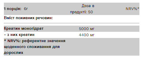 Науково доведено, що креатин підвищує фізичну працездатність під час коротких безперервних вправ високої інтенсивності (корисного ефекту креатину можна досягти, споживаючи принаймні 3 г креатину на день)*.