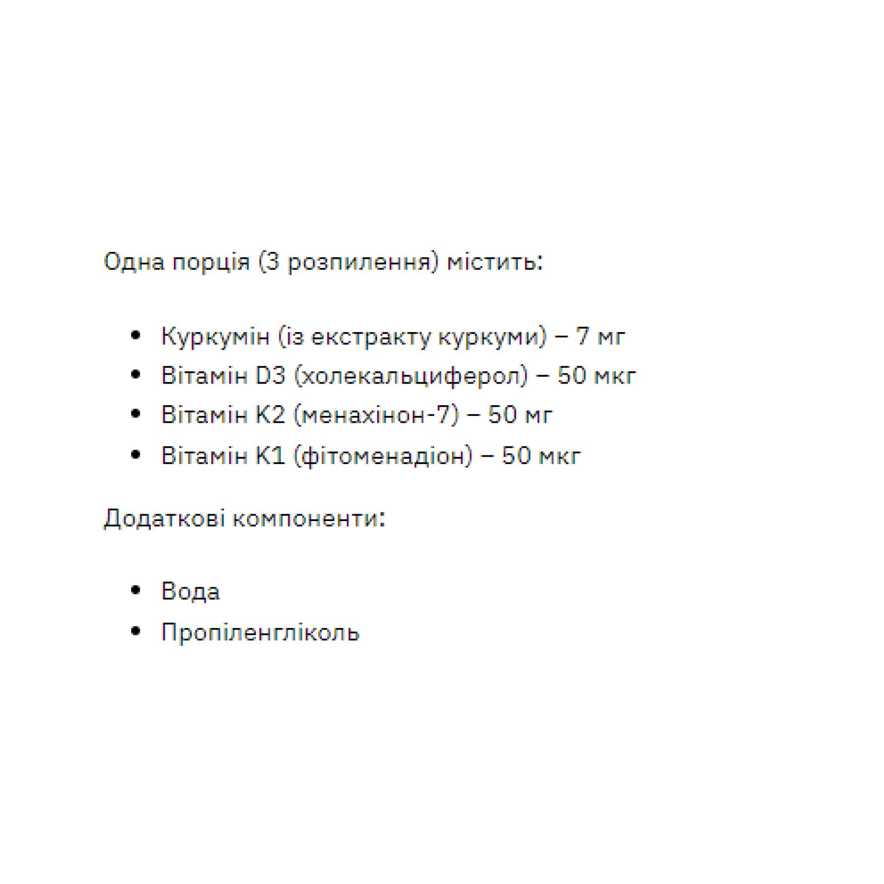 Спрей Stark Curcumin & D3-K2-K1 Liquid Complex містить комплекс вітамінів D3, K2 і K1, доповнений рідким екстрактом куркуміну для кращого засвоєння.