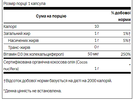 Як зробити вітамін D, який продовжує хвалитися фахівцями в галузі охорони здоров'я та підтверджений незліченними науковими дослідженнями, ще краще? Змішайте його з кокосовим маслом із середньою довжиною ланцюга тригліцеридів. Swanson Вітамін D3 з кокосовим маслом робить саме це. Кокосова олія не тільки забезпечує швидку енергію, яка може бути швидко розщеплена та використана організмом, але й сприяє швидкому засвоєнню жиророзчинного вітаміну D – найкращого з обох світів.