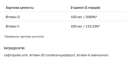 VITAMIN D3 4000 + K2 DROPS – це рідка харчова добавка, призначена для використання як доповнення до вашого щоденного раціону з вітамінами D та K! Якщо ви хочете, щоб ваші кістки були здоровими та міцними, ви звернулися за адресою! Препарат є поєднанням двох дуже важливих для нашого організму вітамінів!
