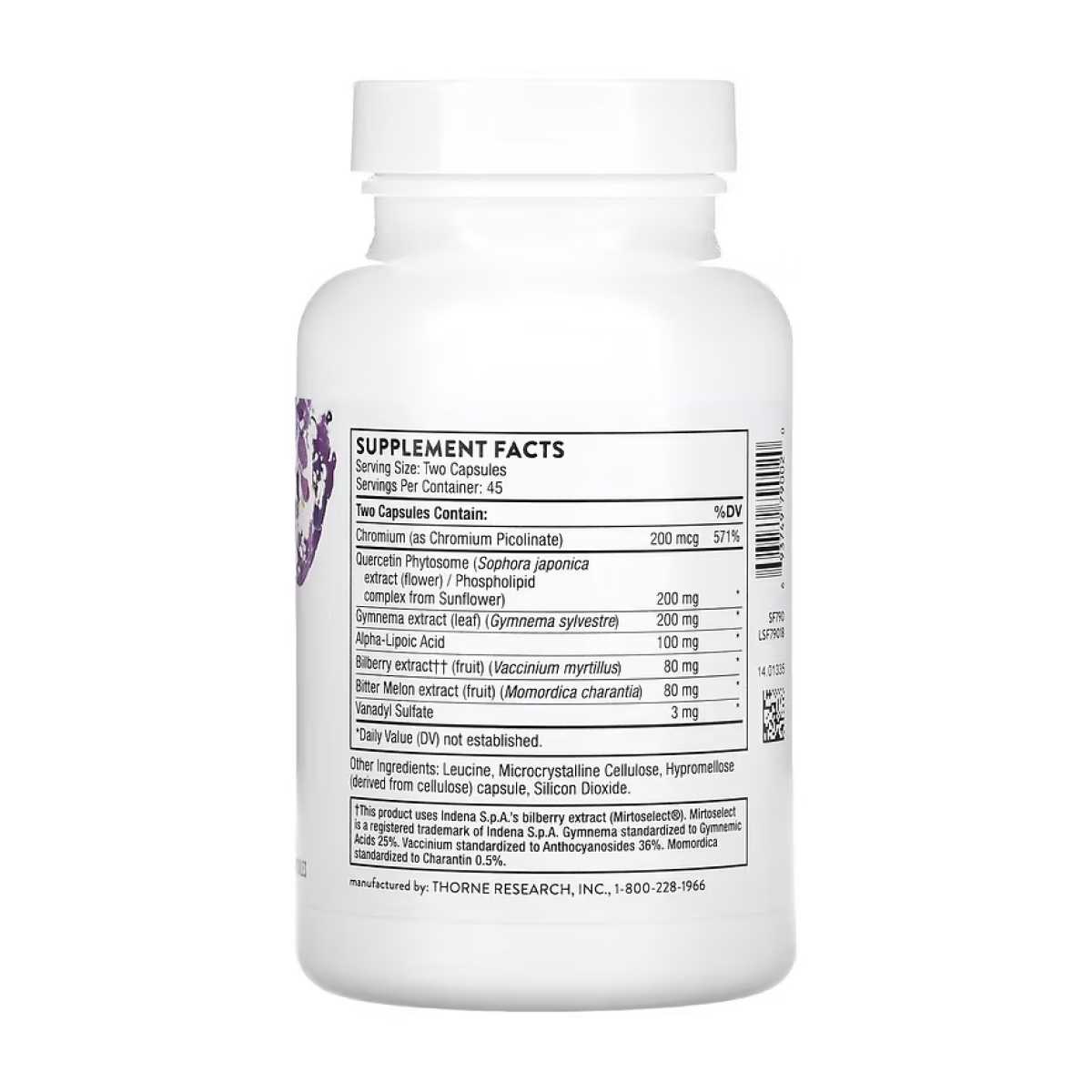 Діабеніл містить комплексну суміш рослинних і поживних речовин для підтримки здорового рівня цукру в крові та допомагає захистити нерви, кровоносні судини, очі та нирки. Gymnema sylvestre вже підтримує нормальний рівень цукру в крові. Momordica charantia (гірка диня), очевидно, покращує використання глюкози та пригнічує синтез глюкози в печінці. Vaccinium myrtillus (чорниця) містить флавоноїди, які, здається, підтримують очні тканини. Ці флавоноїди та кверцетин зміцнюють кровоносні судини та допомагають підтримувати здоров’я сполучних тканин. Кверцетин – в ексклюзивній фітосомі Thorne для оптимального засвоєння – також пригнічує перетворення глюкози на сорбіт, який інакше може накопичуватися в кришталику ока, у нирках і нервах. Ліпоєва кислота може значно зменшити перекисне окислення ліпідів нервової тканини. Піколінат хрому та ванадилсульфат включені, щоб допомогти підтримувати нормальний рівень гемоглобіну A1C.