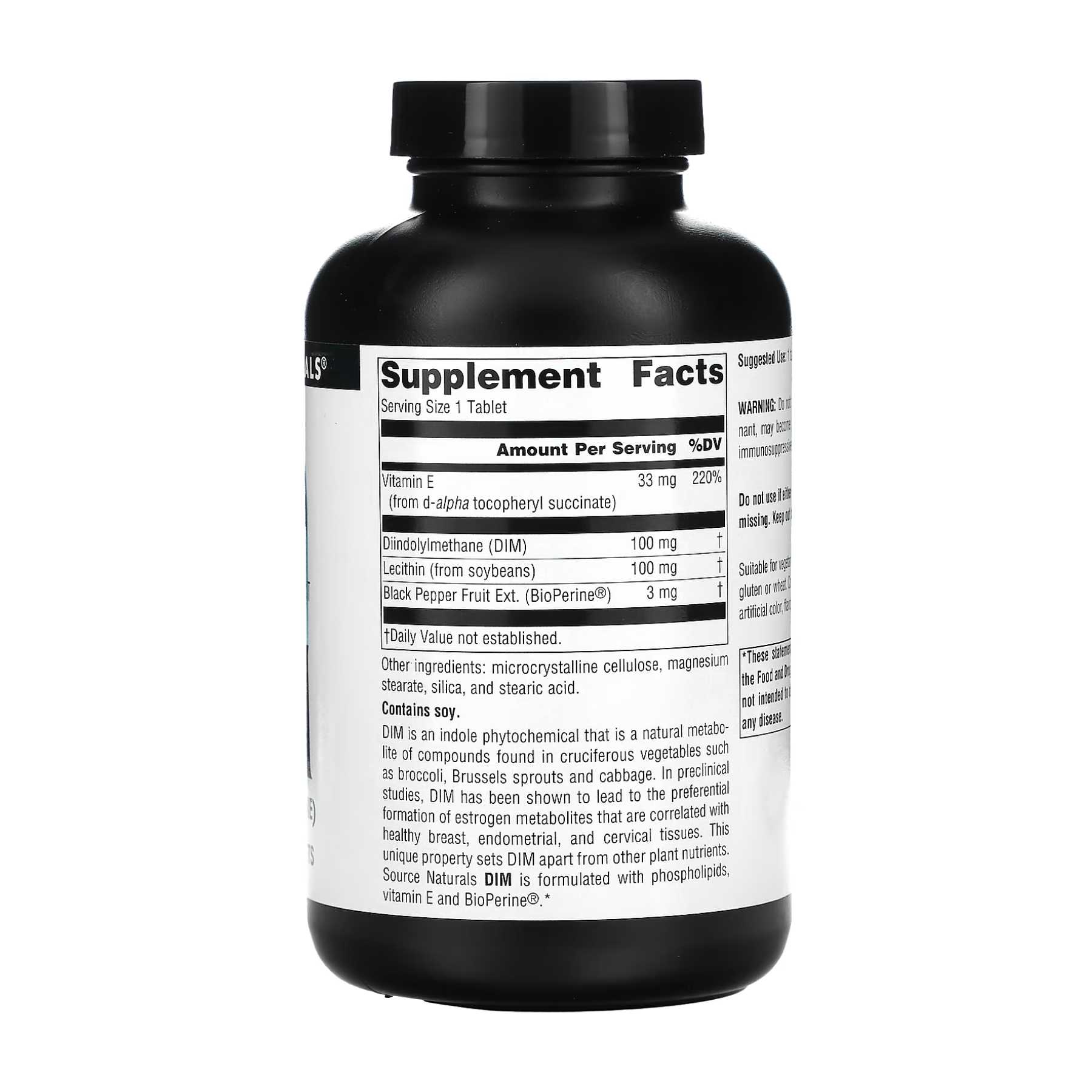 ДІМ — це фітохімічний індол, який є природним метаболітом сполук, що містяться в овочах сімейства капустяних, як-от броколі, брюссельська капуста та качанна капуста. Доклінічні дослідження показали, що дііндолілметан сприяє утворенню метаболітів естрогену, які допомагають підтримувати здоров’я тканин молочних залоз, внутрішньоматкових і цервікальних тканин. Ця унікальна властивість відрізняє ДІМ від інших поживних рослинних речовин. ДІМ від Source Naturals містить фосфоліпіди, вітамін E та BioPerine®.