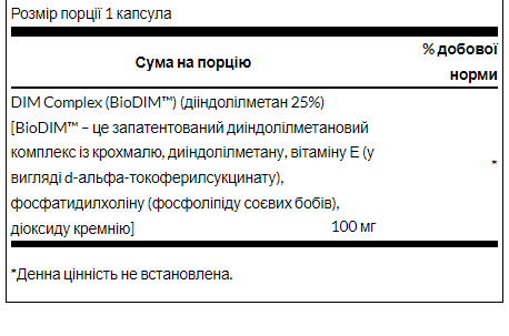 Swanson BioDIM™ (комплекс DIM) є стабілізованою біодоступною формою дієтичного DIM (дііндолілметану). DIM – це секрет користі для здоров'я від овочів сімейства хрестоцвітих, таких як капуста та броколі. Але вам доведеться з'їсти їх кілограмами, щоб зрівнятися потужністю з однією капсулою BioDIM™. Для чоловіків, стурбованих здоров'ям передміхурової залози, і для жінок, стурбованих безліччю ефектів, що виникають внаслідок змін у середньому віці, BioDIM™ пропонує першокласну дієтичну підтримку. Swanson BioDIM™ легко та доступно забезпечує підживлення для хрестоцвітих!
