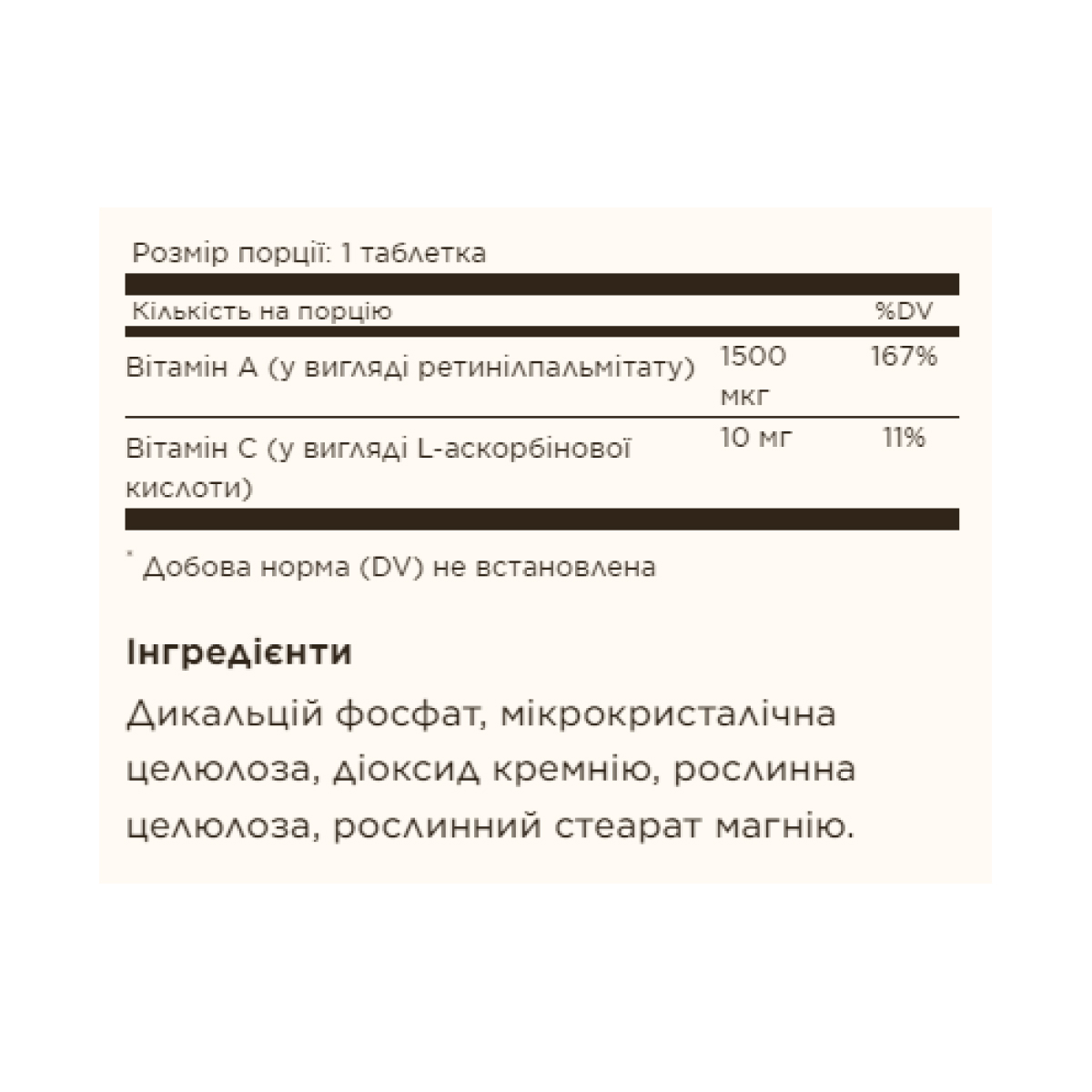 Цей продукт містить 1500 мкг вітаміну А, еквівалентних 5000 МО.