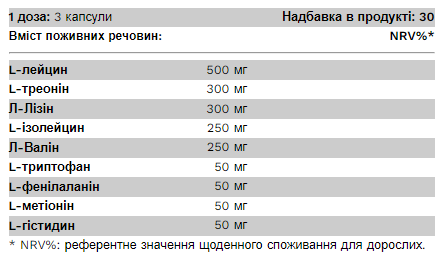 Штрихкод: 5999105908418Наш амінокислотний капсульований продукт EAA — це комплексна формула, яка містить усі 9 незамінних амінокислот. Рекомендоване дозування: приймати 3 х 1 капсулу на день, запиваючи достатньою кількістю рідини перед їжею для 3 осіб. Вага нетто: 64,7 г Інгредієнти: швидкорозчинний L-лейцин, харчовий желатин, L-треонін, L-лізин, швидкорозчинний L-ізолейцин, швидкорозчинний L-валін, L-триптофан, L-фенілаланін, L-метіонін, L-гістидин, барвник (оксид заліза) Попередження: Зберігати в недоступному для маленьких дітей місці! Продукт не замінює змішане харчування та здоровий спосіб життя! Не перевищуйте рекомендовану добову норму споживання! Інформація про алергени: виготовлено на заводі, який переробляє молоко, яйця, глютен, сою, арахіс, лісові горіхи, рибу та інгредієнти ракоподібних. Зберігає якість: до кінця місяця, зазначеного на упаковці (місяць/рік). Зберігання: Зберігати продукт у місці, захищеному від сонячного світла та інших теплових впливів, при температурі від 6 до 26 °C і при відносній вологості повітря 65%!