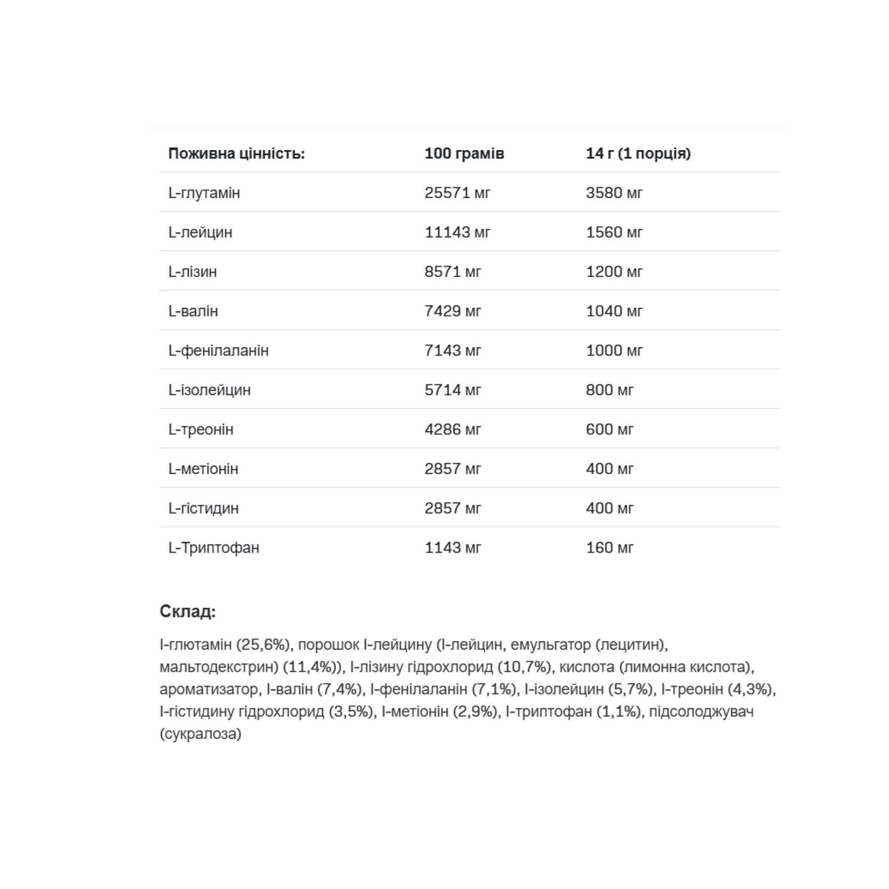 l-глютамін (25,6%), порошок l-лейцину (l-лейцин, емульгатор (лецитин), мальтодекстрин) (11,4%)), l-лізину гідрохлорид (10,7%), кислота (лимонна кислота), ароматизатор, l-валін (7,4%), l-фенілаланін (7,1%), l-ізолейцин (5,7%), l-треонін (4,3%), l-гістидину гідрохлорид (3,5%), l-метіонін (2,9%), l-триптофан (1,1%), підсолоджувач (сукралоза)