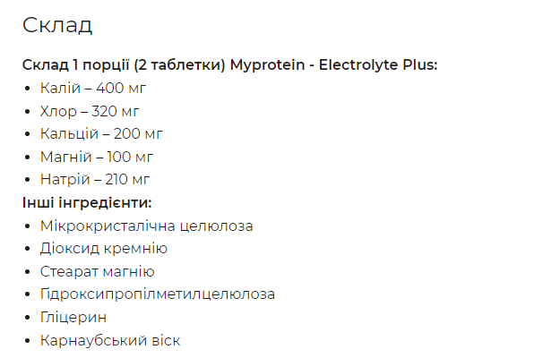 Ці таблетки допомагають підтримувати водно-сольовий баланс після напруженого тренування або спортивної гри, тому що в них містяться найважливіші солі, які виходять з потом. Суміш незамінних електролітів; магній допомагає у відновленні водно-сольового балансу; заповнює солі, що виходять із потом; ідеально підходить для тренувань за теплої погоди. Ці електроліти життєво необхідні для забезпечення організму електричною енергією, яка потрібна для підтримки різних функцій організму людини, включаючи кальцій, який незамінний у нервових процесах і калій, що підтримує нормальну м'язову активність – що важливо як для загального стану здоров'я, так і для здатності повністю присвячувати себе тренуванням. Магній бере участь у підтримці водно-сольового балансу. Кальцій підтримує нормальну м'язову активність та роботу систем нейропередачі. Калій підтримує нормальну м'язову активність та функціонування нервової системи.