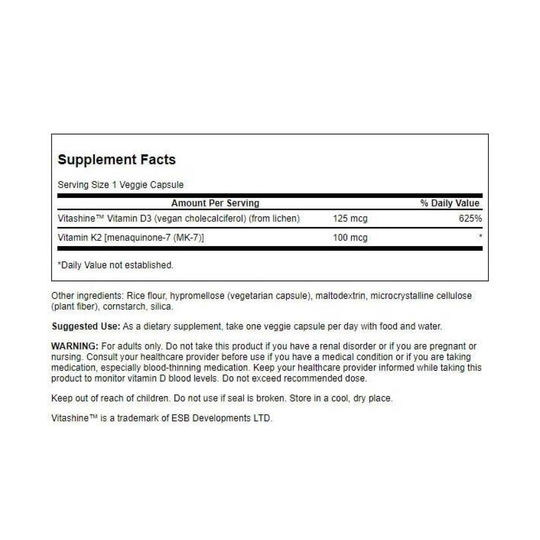 Що робити, якщо ви вже приймаєте добавки з вітамінами D і K або отримуєте їх зі свого раціону? Тепер Swanson пропонує низьку дозу вітамінів D3 та K2 спеціально для вас. Вітаміни D3 і K2 у низьких дозах від Swanson містять 50 мкг (2000 МО) веганського вітаміну D3, отриманого з лишайника, і 75 мкг вітаміну K2 без сої, отриманого з нуту, у вигляді МК-7 у формі веганської капсули для вживання один раз на день, що допомагає підтримувати здоров’я серцево-судинної системи та зміцнювати кістки.