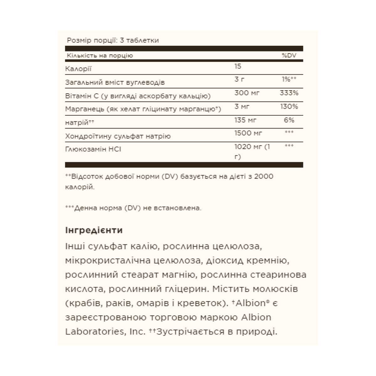 Глюкозамін сприяє здоров’ю суглобів і діє на підтримку структурної основи здорових суглобів. Глюкозамін і хондроїтин є важливими компонентами глікозаміногліканів, необхідного структурного матеріалу здорового хряща. Хондроїтин підтримує рухливість і гнучкість. Вітамін С бере участь у формуванні колагену, білка, необхідного для формування сухожиль і зв’язок. Марганець відіграє важливу роль у виробництві здорових сполук хряща.