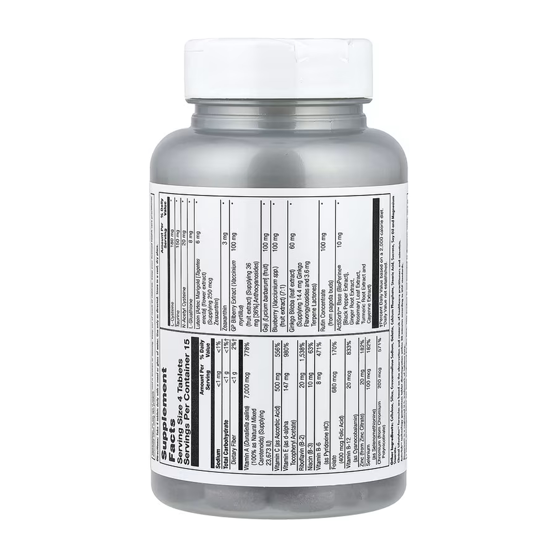 Це комплексна формула для підтримки здоров’я очей, що об’єднує важливі вітаміни (A, C, E, B-групи), мінерали (цинк, селен, хром) і потужні фітонутрієнти — такі як лютеїн, зеаксантин, екстракти чорниці, гохі, гінкго білоба та рутина.