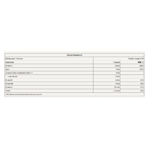 Другові інгредієнти включають екстракти чорниці 100 мг, гохі 100 мг, гінкго білоба 60 мг, рутина 100 мг.