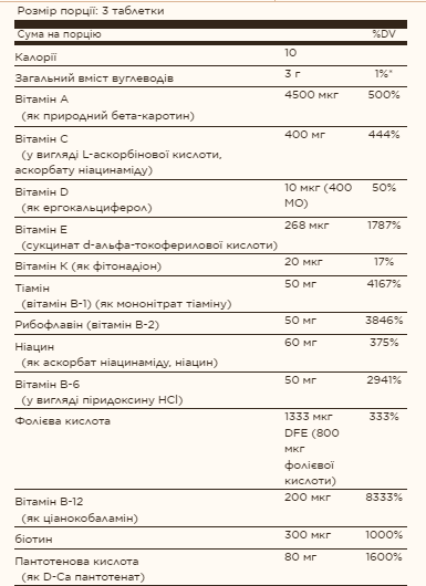 Мікрокристалічна целюлоза, целюлоза (рослинного походження), діоксид кремнію, стеаринова кислота (рослинного походження), порошок чорної моркви (барвник), рослинний стеарат магнію, гліцерин (рослинного походження), діоксид титану (барвник), манітол, глазур із натурального пальмового листа, мальтодекстрин.