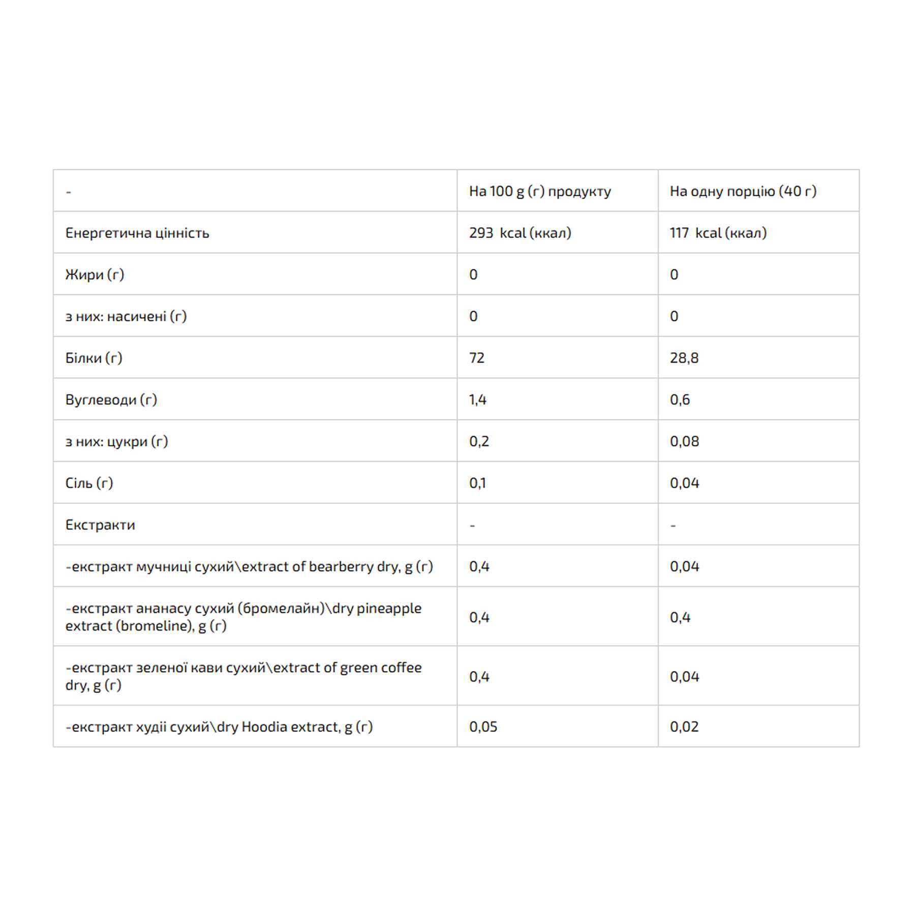 Склад: білки сироваткові (концентрат, ізолят та гідролізат сироваткового білку) – 72%, порошок сублімованих фруктів або ягід (ідентичні найменуванню смаку на упаковці) – 1,5%, регулятор кислотності – лимонна кислота (Е330), екстракт мучниці сухий – 0,1%, екстракт ананасу сухий (бромелайн) – 0,1%, екстракт зеленої кави сухий – 0,1%, екстракт худії сухий – 0,05%, ароматизатор харчовий, ідентичний натуральному (ідентичний найменуванню смаку на упаковці), підсолоджувач – сукралоза (Е955), барвник натуральний.