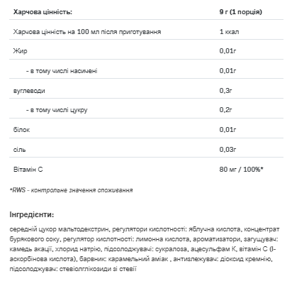 ALLNUTRITION FITKING DELICIOUS DRINK — наш найновіший продукт, який є чудовим доповненням до будь-яких фізичних навантажень та тренувань. FITKING DELICIOUS DRINK був створений нами у вигляді порошку, який при додаванні у воду – створює прекрасний, зволожуючий ароматний напій, який в одній порції – забезпечує організм лише однією калорією! Наш смачний напій збагачений вітаміном С, тому він є ідеальним рішенням для людей, які тренуються як у приміщенні, так і на відкритому повітрі. Відтепер вам не страшна ні зима, ні сезон грипу! 🙂 Що дуже важливо, пакетики FITKING DELICIOUS DRINK, що освіжають з фруктовим смаком, є напоями без калорій, з додаванням глікозидів стевії. Ідеальна формула напою без штучних ароматизаторів, барвників та консервантів – продукт не містить цукру та калорій. Харчова цінність: 9 г (1 порція) Харчова цінність у 100 мл після приготування 1 ккал Товстий 0,01 г – включаючи наскон 0,01 г Вуглеводи 0,3 г – у тому числі цукру 0,2 г білок 0,01 г Сіль 0,03 г Вітамін С 80 мг / 100% * * NRV – еталонне значення поживних речовин Інгредієнти: мальтодекстрин середнього цукру, регулятори кислотності: яблучна кислота, лимонна кислота; ароматизатори, загусник: камедь акації, хлорид натрію, підсолоджувачі: сукралоза, ацесульфам К; вітамін С (l-аскорбінова кислота), барвник: бета-каротин, агент проти стеження: діоксид кремнію, підсолоджувач: глікозиди стевіолу