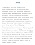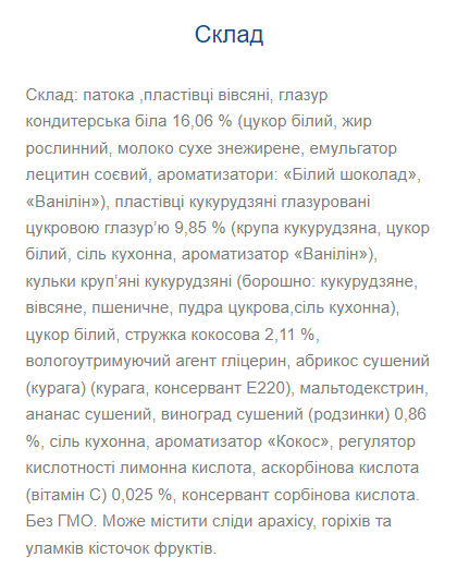 Патока, пластівці вівсяні, глазур кондитерська біла 16,06% (цукор, жир рослинний, молоко сухе знежирене, емульгатор соєвий лецитин, ароматизатори: «Білий шоколад», «ванілін»), пластівці кукурудзяні глазуровані цукровою глазур'ю 9, 8 , цукор, сіль кухонна харчова, ароматизатор «Ванілін»), кульки круп'яні кукурудзяні (борошно: кукурудзяне, вівсяне, пшеничне, пудра цукрова, сіль кухонна), цукор, стружка кокосова 2,11%, вологоутримуючий агент гліцерин, абрикос сушений (курага, консервант Е220), мальтодекстрин, ананас сушений, виноград сушений (родзинки) 0,86%, сіль кухонна, ароматизатор “Кокос”, регулятор кислотності лимонна кислота, аскорбінова кислота (вітамін С) 0,025%, консервант сорбінова кислота. Без ГМО. Може містити сліди арахісу, горіхів та уламків кісточок фруктів.