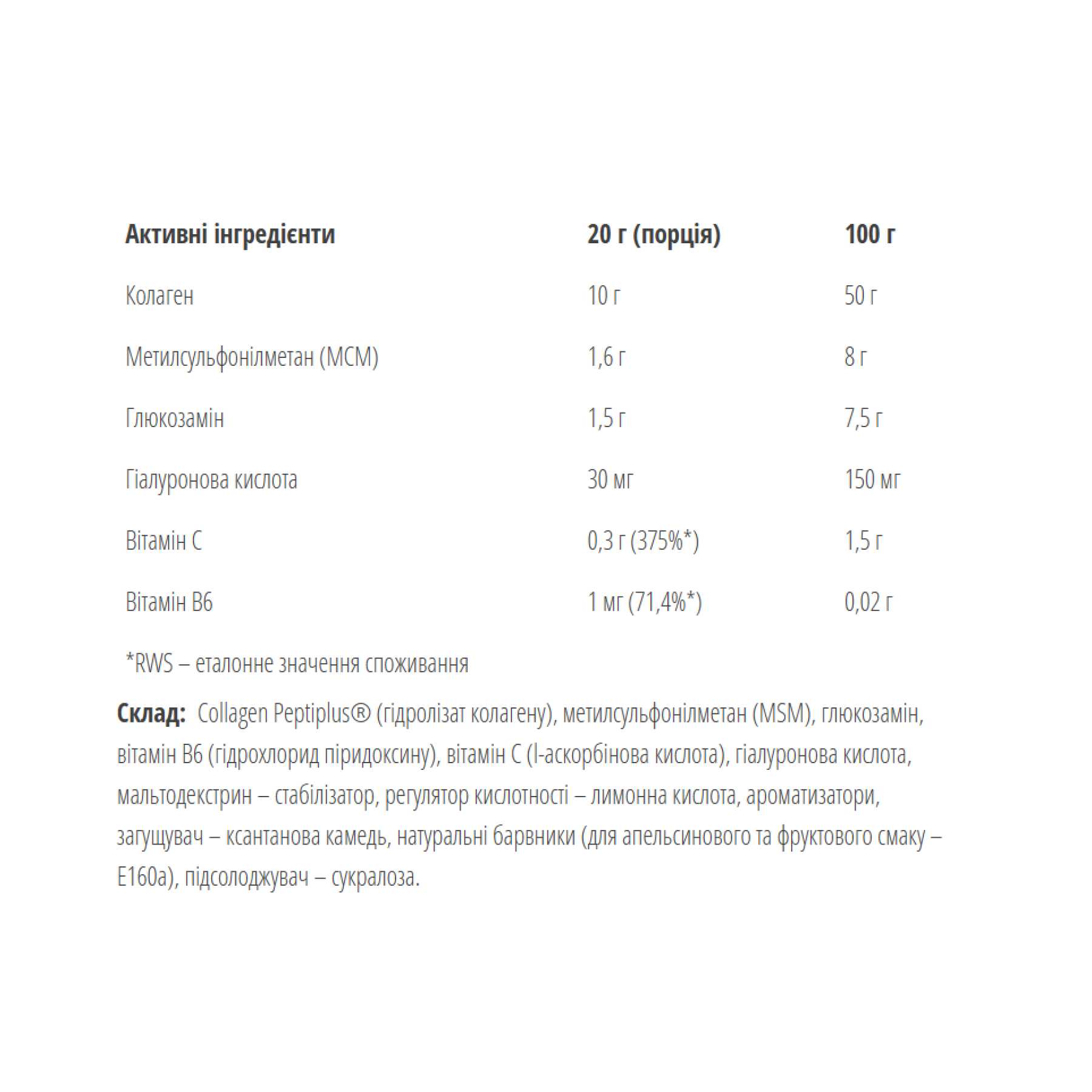 БАД містить у своєму складі повний набір інгредієнтів, що підтримують міцність опорно-рухового апарату . Це комплекс вітамінів, який допоможе нам у боротьбі за здорові та міцні суглоби . Одним із найважливіших інгредієнтів добавки є колаген, який є одним із найважливіших білків, які містяться в нашому організмі. Колаген є основним будівельним матеріалом для шкіри, кісток, сухожиль і суглобів . Благотворно впливає на вироблення синовіальної рідини, що впливає на еластичність і твердість хряща. Дефіцит колагену є результатом целюліту, зниження пружності шкіри та її зволоження. Виробник Bodyperson Labs створив добавку, яка завдяки ідеально продуманим інгредієнтам допомагає відновити еластичність суглобів, завдяки чому ми також знайдемо в складі глюкозамін, який значно полегшує вбудовування сірки в наш хрящ.