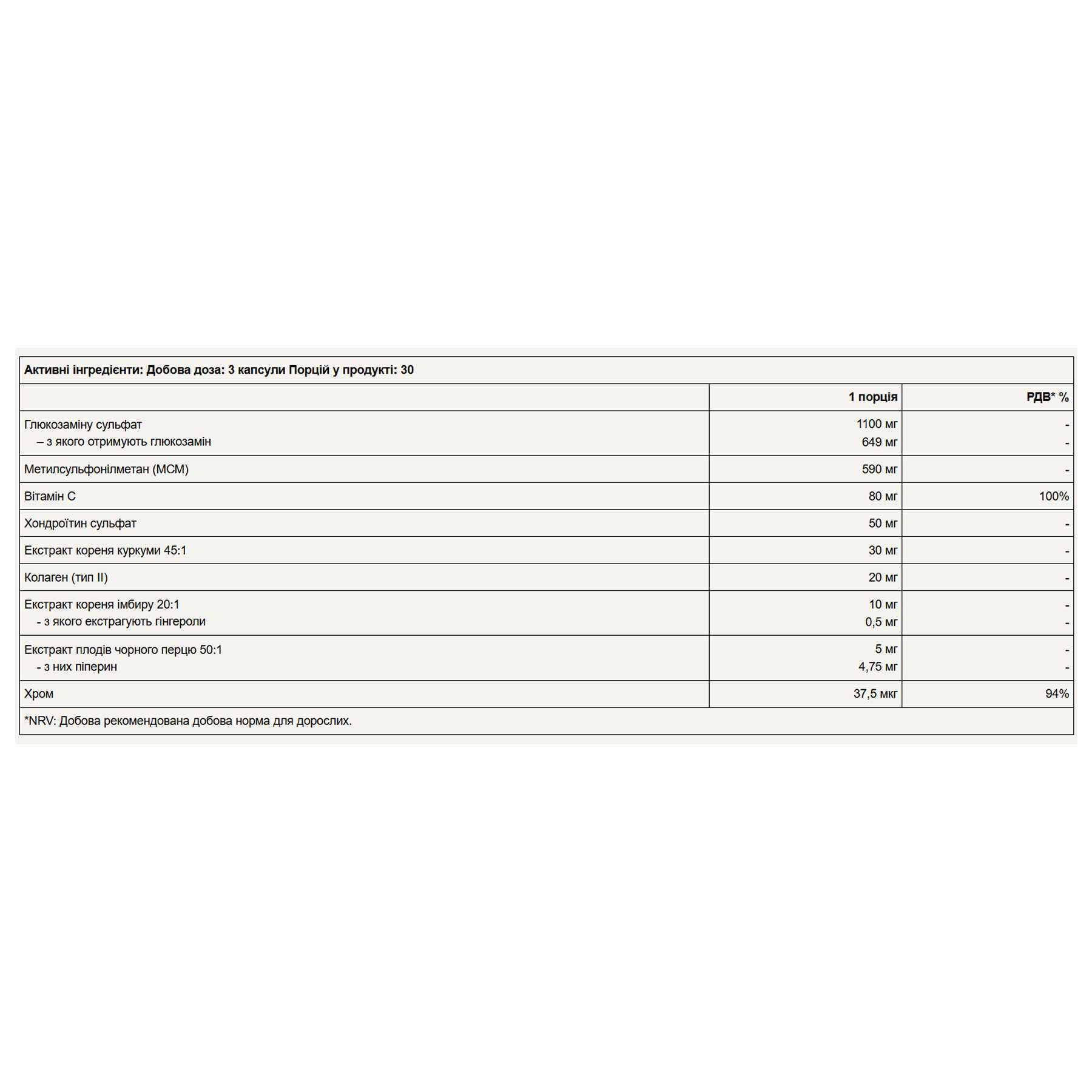 Капсули з дієтичною добавкою з глюкозаміном, МСМ, вітаміном С, хондроїтином, порошком гідролізованого курячого хряща, мінералами та рослинними екстрактами.