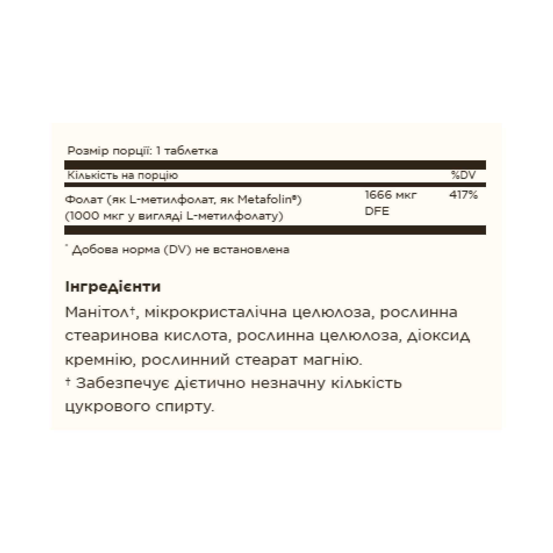 Манітол†, мікрокристалічна целюлоза, рослинна стеаринова кислота, рослинна целюлоза, діоксид кремнію, рослинний стеарат магнію.