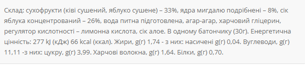 Сухофрукти (ківі сушений, яблуко сушене) – 33%, ядра мигдалю подрібнені – 8%, сік яблука концентрований – 26%, вода питна підготовлена, агар-агар, харчовий гліцерин, регулятор кислотності – лимонна кислота, сік алое.
