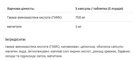 ALLNUTRITION ГАМК Гамма-аміномасляна кислота – це органічна хімічна сполука, що відноситься до амінокислот, яка діє в організмі як нейротрансмітер, речовина, що діє на нервову систему і має гальмівну дію. ГАМК призначена для людей, які зазнають інтенсивних фізичних та розумових навантажень. Цей продукт має заспокійливу дію, що призводить до більш швидкого засинання і глибшого сну, і таким чином продовжує фазу БДГ.