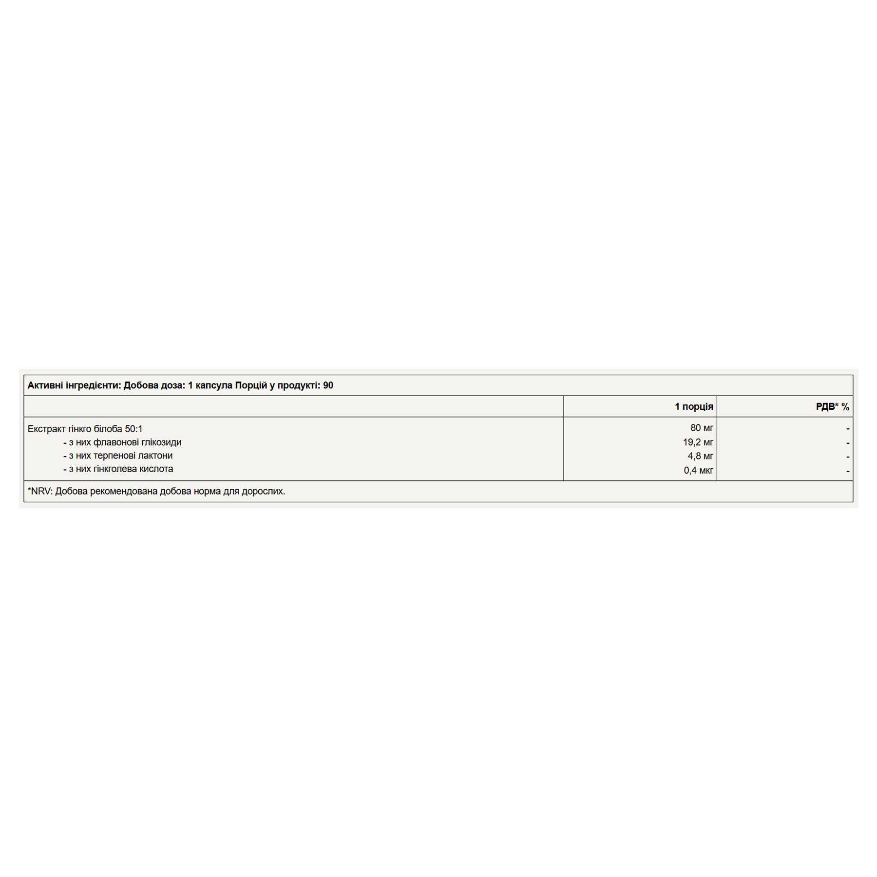 Склад : кукурудзяний крохмаль, оболонка капсули (гідроксипропілметилцелюлоза), екстракт листя гінкго білоба (Ginkgo biloba L.) 50:1, агент проти злежування (діоксид кремнію).