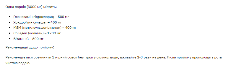 Компоненти, що входять до складу даного препарату, посилюють дію один одного, тим самим дозволяючи досягти найбільш потужного ефекту та всебічного захисту суглобів та зв'язок.