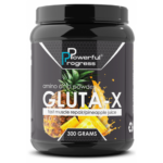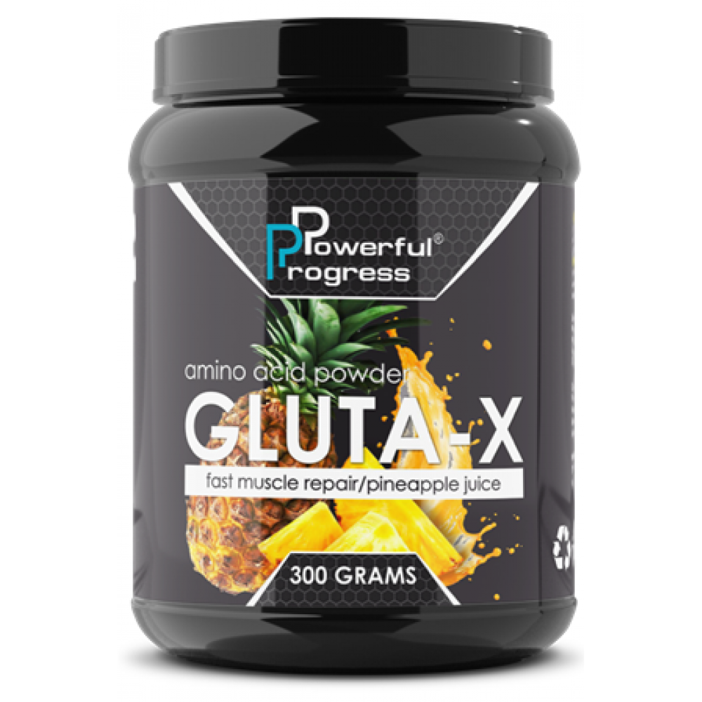 GLUTA-Х від POWERFUL PROGRESS – високоефективна харчова добавка, яка розроблена для підтримки росту м'язової маси, для антикатаболічного захисту та для підвищення ефективності підготовки спортсменів до змагань. Ефективність продукту зумовлена здатністю глютаміну збільшувати об’єм м'язових волокон, крім того він бере активну участь в біосинтезі білків у організмі атлета. З кожною порцією GLUTA-Х спортсмен отримує 10 грам високо очищеного глутаміну, що сприяє підтримці процесу відновлення після вправ. GLUTA-Х також можна додавати в білковий коктейль або улюблений напій після тренування. Як і в інших продуктах компанії, в GLUTA-X використовуються виключно німецькі смакові добавки відомої фірми «CONDETTA» – вони повністю натуральні і безпечні для здоров'я споживача, роблячи смак самого амінокислотного напою злегка солодким та насиченим. Амінокислотний напій з GLUTA-X надає спортсмену не тільки ефективне відновлення м’язової маси, а й насичені та чудові фруктові смаки свіжої полуниці, тропічного апельсинового або ж ананасового соку.