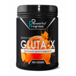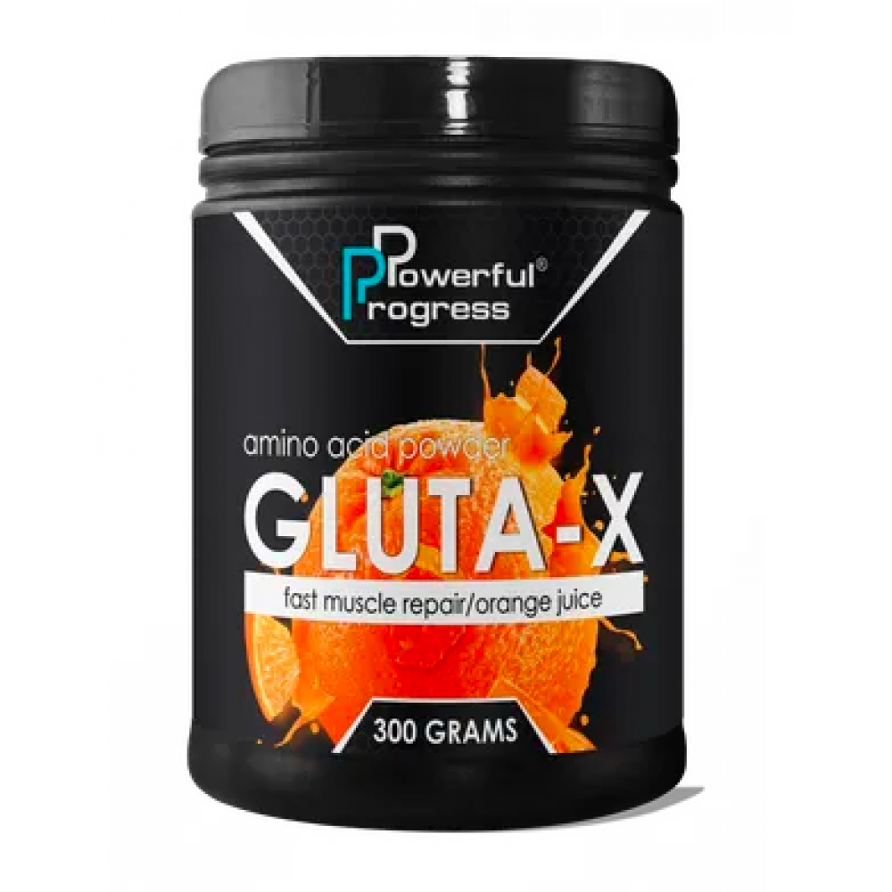 GLUTA-Х від POWERFUL PROGRESS – високоефективна харчова добавка, яка розроблена для підтримки росту м'язової маси, для антикатаболічного захисту та для підвищення ефективності підготовки спортсменів до змагань. Ефективність продукту зумовлена здатністю глютаміну збільшувати об’єм м'язових волокон, крім того він бере активну участь в біосинтезі білків у організмі атлета. З кожною порцією GLUTA-Х спортсмен отримує 10 грам високо очищеного глутаміну, що сприяє підтримці процесу відновлення після вправ. GLUTA-Х також можна додавати в білковий коктейль або улюблений напій після тренування. Як і в інших продуктах компанії, в GLUTA-X використовуються виключно німецькі смакові добавки відомої фірми «CONDETTA» – вони повністю натуральні і безпечні для здоров'я споживача, роблячи смак самого амінокислотного напою злегка солодким та насиченим. Амінокислотний напій з GLUTA-X надає спортсмену не тільки ефективне відновлення м’язової маси, а й насичені та чудові фруктові смаки свіжої полуниці, тропічного апельсинового або ж ананасового соку.