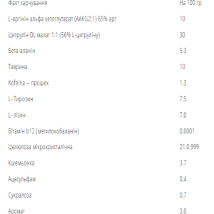 L-глютамін, регулятор кислотності – лимонна кислота, ароматизатор, таурин, підсолоджувачі: сукралоза, ацесульфам; піридоксину гідрохлорид (вітамін В6).