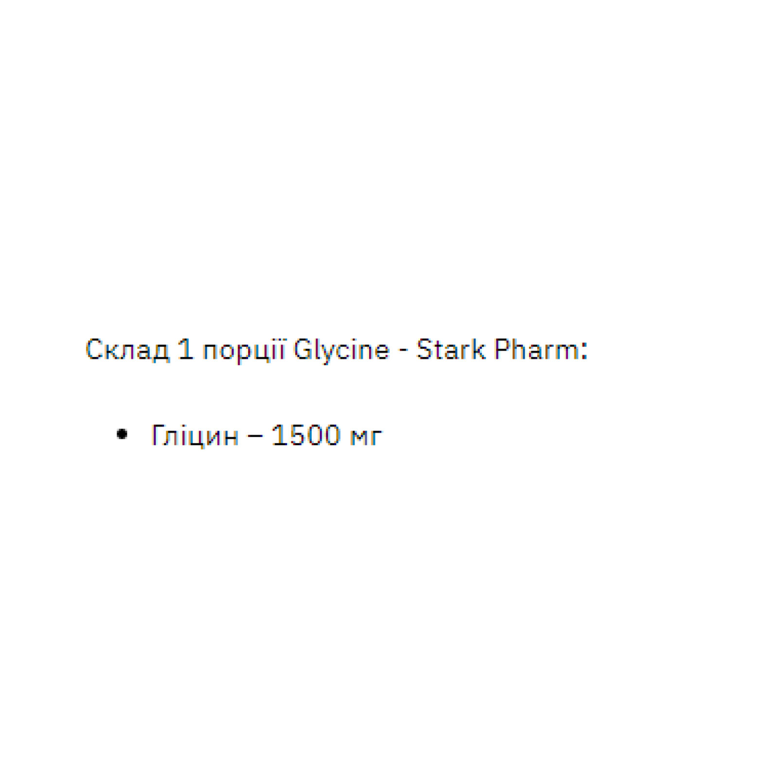 Харчова добавка Stark Glycine – Stark Pharm містить гліцин, є нейромедіаторною амінокислотою, що проявляє паралельну дуалістичну дію. Гліцинові рецептори є в багатьох ділянках головного та спинного мозку. Зв'язуючись з рецепторами (кодовані генами GLRA1, GLRA2, GLRA3 і GLRB), гліцин викликає «гальмуючий» вплив на нейрони, зменшує виділення з нейронів «стимулюючих» амінокислот, таких як глутамінова кислота, і підвищує виділення ГАМК.