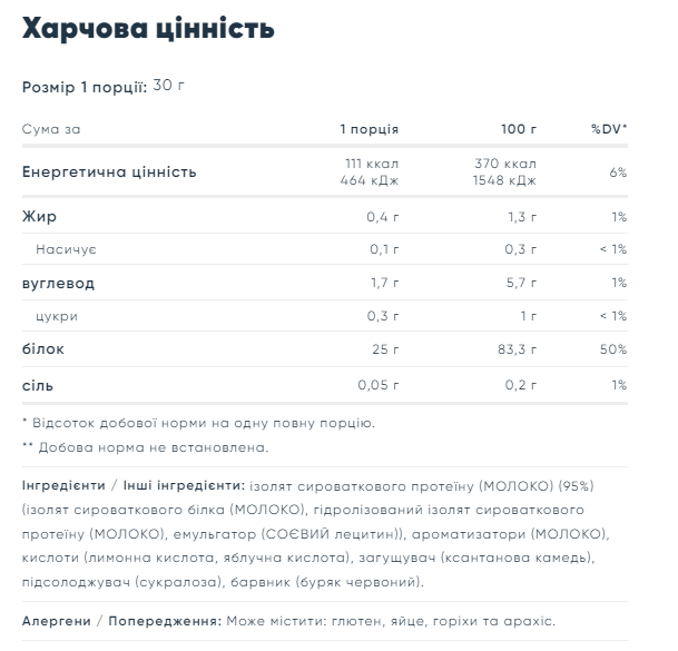 Змішайте 1 мірну ложку (31 г) з 240-360 мл холодної води. Пийте після тренування, щоб сприяти відновленню, або в будь-який час протягом дня, щоб задовольнити добову потребу в білку.