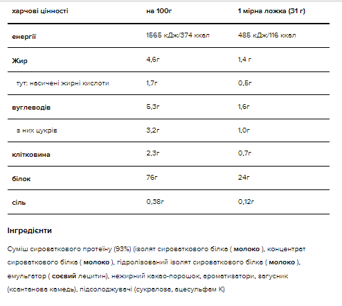 Ізолят сироваткового протеїну є однією з найчистіших форм сироваткового білка. Кожна порція продукту містить 24 г сироваткового протеїну, що швидко засвоюється, з мінімальним вмістом жиру, лактози та інших непотрібних компонентів.