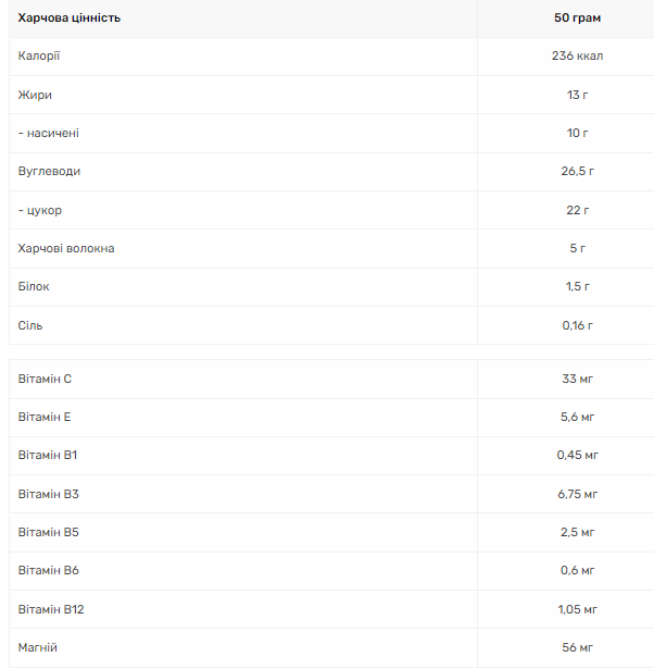 Протеїновий батончик GO ON – це смачна білкова закуска, яку ви можете з'їсти під час або після тренування, а також будь-коли вашого активного дня. GO ON – завжди вперед! Вміст елементів в 1-й порції 50 г: Калорії 236 ккал Жири 13 г – насичені 10 г Вуглеводи 26,5 г – цукор 22 г Харчові волокна 5 г Білок 1,5 г Сіль 0,16 г Вітамін С 33 мг Вітамін Е 5 ,6 мг Вітамін В1 0,45 мг Вітамін В3 6,75 мг Вітамін В5 2,5 мг Вітамін B6 0,6 мг Вітамін B12 1,05 мг Магній 56 мг L-Карнітин 155 мг Інгредієнти: кокосова стружка 28% (містять діоксид сірки), молочний шоколад 20% (цукор, какао-масло, сухе незбиране молоко, тертий какао, зневоднений молочний жир, емульгатор: лецитин (з соєвих бобів); натуральний ароматизатор ванілі), цукор, глюкозний сироп, кукурудзяне волокно, лактоза, лактоза з молока), зволожувач: гліцерол; суха сироватка (з молока), що збагачують речовини: L-карнітин 0,31% цитрат магнію, вітамін С, ніацин, вітамін Е, пантотенова кислота (B5), вітамін B6, тіамін (B1), вітамін B12; морська сіль, ароматизатор, емульгатор: лецитини (з сої)