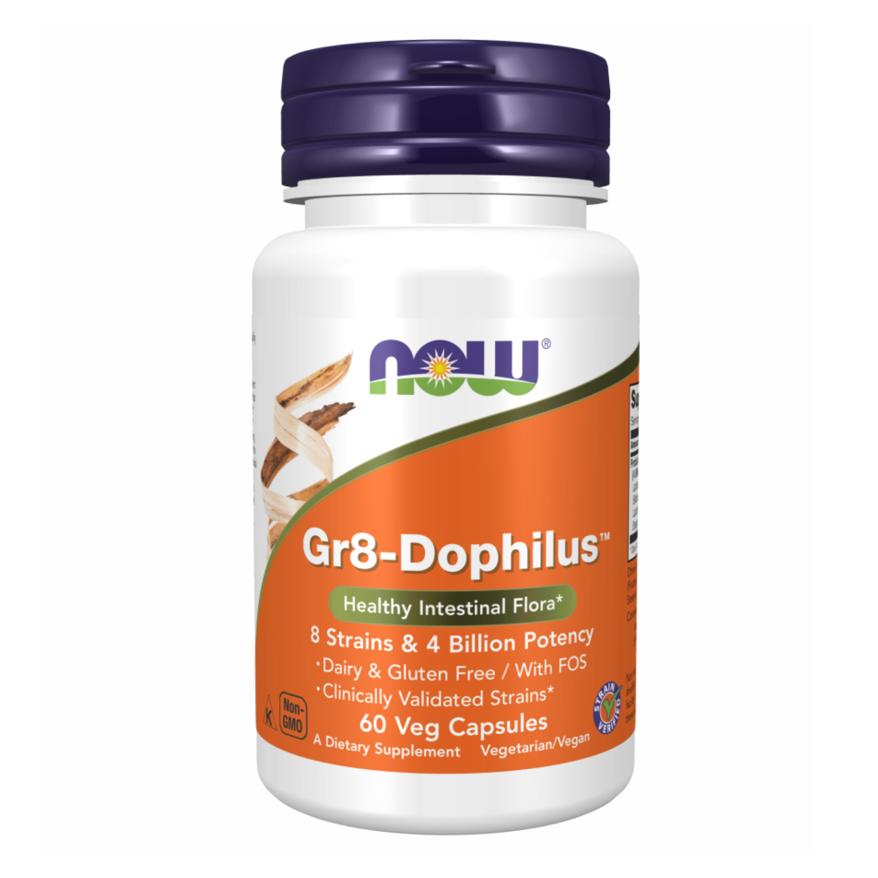 NOW Gr8-Dophilus — це комбінація 8 різних видів кислотостійких штамів пробіотичних бактерій, які, як відомо, природним чином колонізують шлунково-кишковий тракт людини. Пробіотичні бактерії мають вирішальне значення для здорового травлення. Вони допомагають підтримувати цілісність слизової оболонки кишечника, підтримують правильну перистальтику кишечника та беруть участь у процесі детоксикації. Gr8-Dophilus використовує штами бактерій, які були клінічно підтверджені для підтримки здорової функції імунної системи. ФОС також міститься в цьому продукті для сприяння здоровому росту організмів Acidophilus і Bifidus.