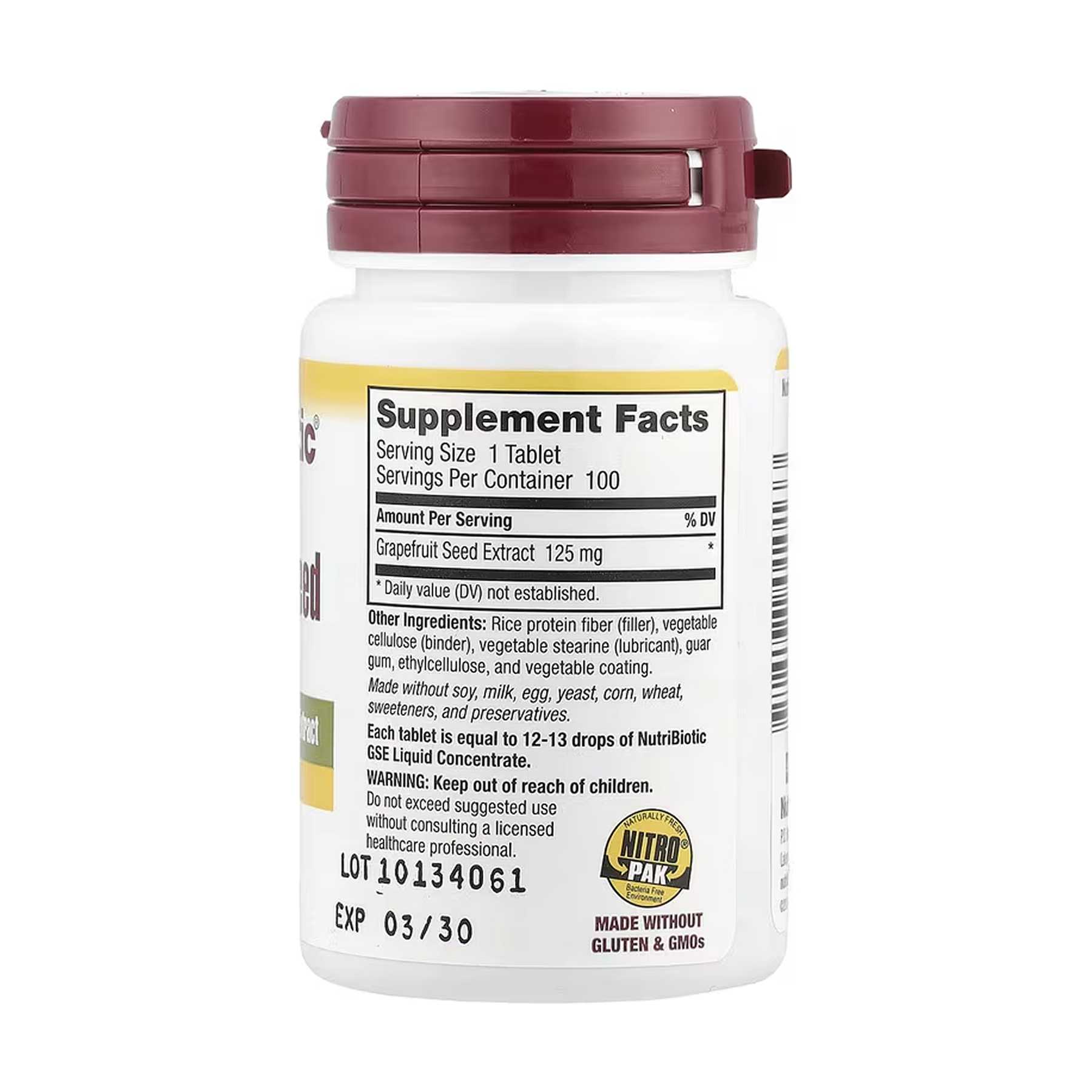 Кожна таблетка містить кількість речовини еквівалентну 12–13 краплям рідкого концентрату NutriBiotic GSE.