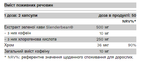 Інгредієнти: екстракт Slenderbean® Coffea Robusta (насіння) 12:1 [Slenderbean® є зареєстрованою торговою маркою Cambridge Commodities Ltd.], воскова кукурудза, крохмаль, харчовий желатин, засіб, що запобігає злежуванню (стеарат магнію), барвник (оксид заліза), піколінат хрому. Попередження: Зберігати в недоступному для маленьких дітей місці! Продукт не замінює змішане харчування та здоровий спосіб життя! Не перевищуйте рекомендовану добову норму споживання!