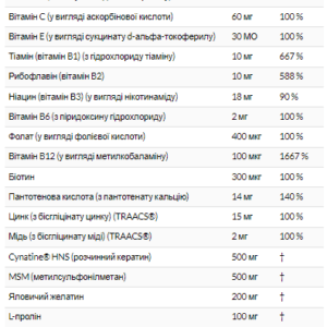 Містить 100 мг колагену й 2500 мкг біотину в 1 порції з двох жувальних мармеладок