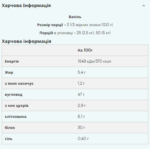 містить 31 г білка та 50 г вуглеводів (вівсяного борошна та мальтодекстрину) на порцію;