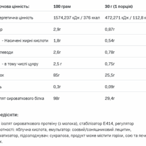 Розмір порції – 1 мірна ложка (25г) Порцій в упаковці – 40 (1кг), 100 (2.5кг), 160 (4кг) Поживна Цінність У 100г У порції (25г) 0.3 г 0.1 г з яких насичених 0.3 г 0.1 г Вуглеводів 2.5 г 0.6 г з яких цукру 2.5 г 0.6 г Білка 90 г 23 г Солі 0.50 г 0.13 г