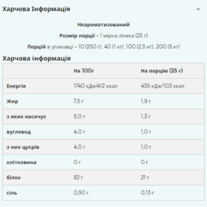 Розмір порції – 1 мірна ложка (25г) Порцій в упаковці – 40 (1кг), 100 (2.5кг), 160 (4кг) Поживна Цінність У 100г У порції (25г) 0.3 г 0.1 г з яких насичених 0.3 г 0.1 г Вуглеводів 2.5 г 0.6 г з яких цукру 2.5 г 0.6 г Білка 90 г 23 г Солі 0.50 г 0.13 г
