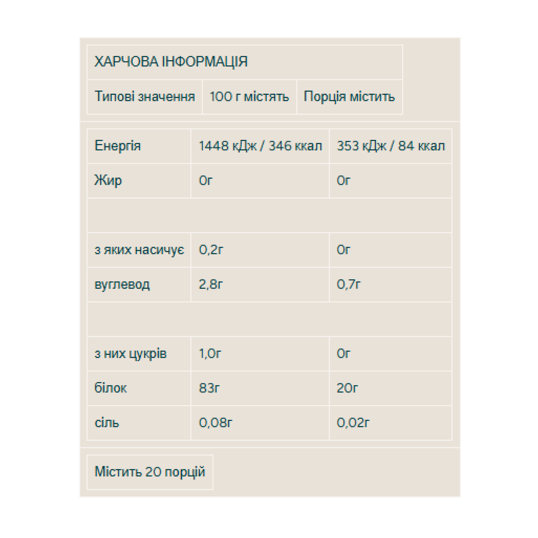 20 г білка на порцію з гідролізованого ізоляту сироваткового білка, що швидко засвоюється