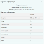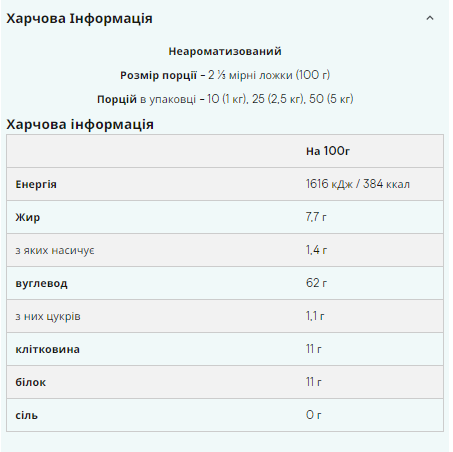 Харчова цінність У порції *RI Калорійність 1616 кДж/384 ккал 18% Жир 7.7 гр 12% з яких насиченого 1.4 гр 7% Вуглеводи 62 гр 19% з яких цукру 1.1 гр 1% Клітковина 11 гр 0 0 4%