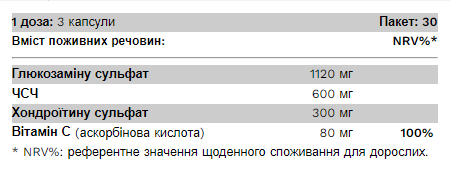 Склад: D-глюкозамін сульфат 2KCl, МСМ, харчовий желатин, хондроїтину сульфат, L-аскорбінова кислота, барвник (оксид заліза).