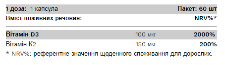 Інгредієнти: наповнювач (кукурудзяний крохмаль, мікрокристалічна целюлоза), харчовий желатин, барвник (оксид заліза), вітамін D (холекальциферол), вітамін K (менахінон)
