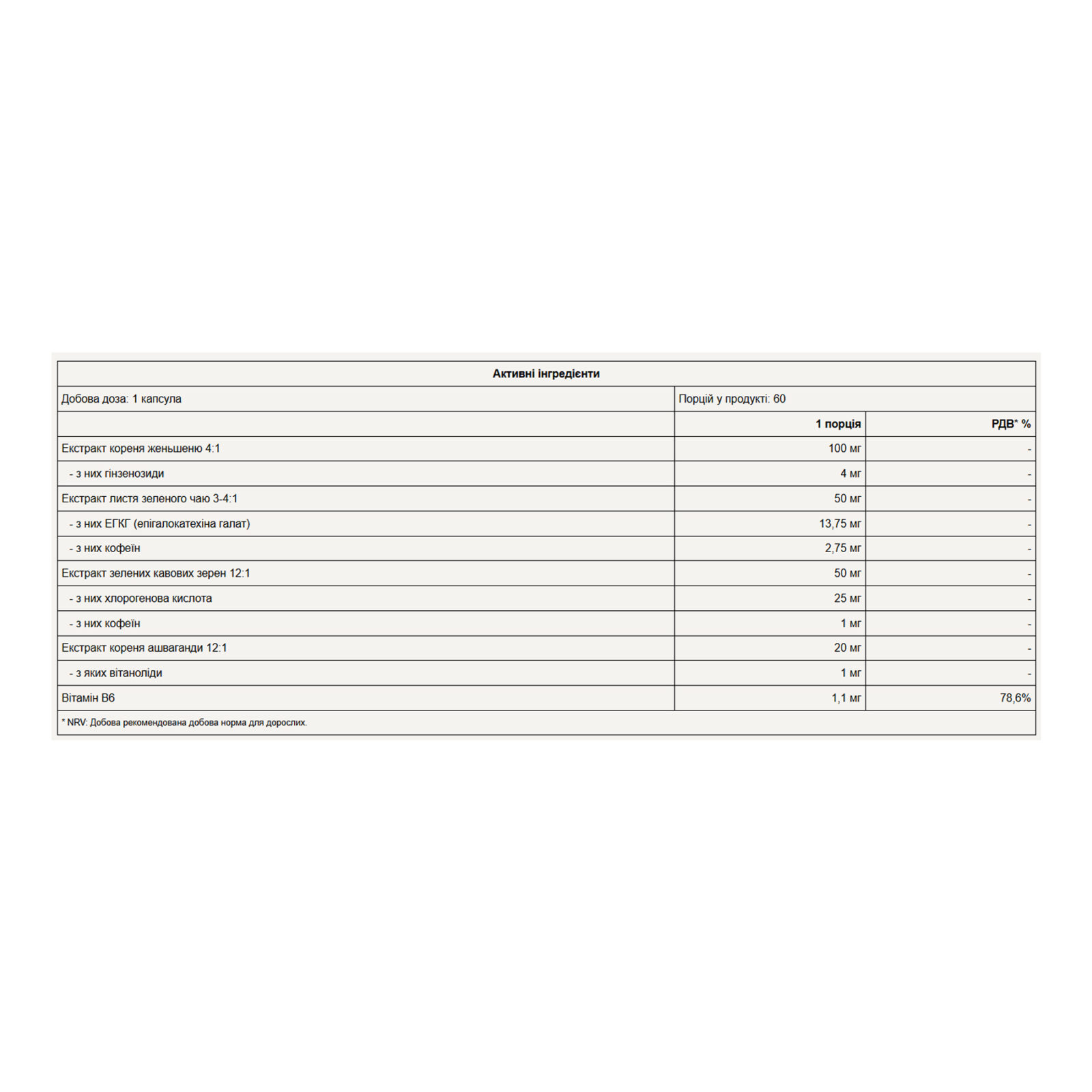 Склад : кукурудзяний крохмаль, оболонка капсули (гідроксипропілметилцелюлоза), екстракт кореня женьшеню (Panax ginseng cameyer) 4:1, екстракт листя зеленого чаю (Camellia Sinensis) 3-4:1, екстракт зерен зеленої кави (Coffea robusta L.) 12:1, екстракт кореня ашваганди (Withania Somnifera Dunal) KSM-66® 12:1, антизлежувач (магнієві солі жирних кислот), піридоксину гідрохлорид. [KSM-66® є зареєстрованою торговою маркою Ixoreal Biomed Inc.].