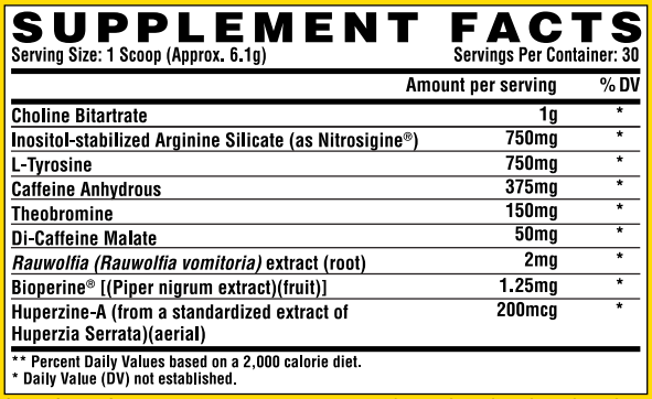 Як приймати Змішайте 1 мірну ложку з 200 мл холодної води і випийте за 30-45 хвилин до тренування. Харчова цінність 6,7 грам Холіна бітартрат 1 г Силікат аргініну, стабілізований інозитом (як Nitrosigine®) 750 мг L-тирозин 750 мг Безводний кофеїн 375 мг Теобромін 150 мг Ді-кофеїн малат 50 мг Екстракт рауволь мг Bioperine® [(екстракт Piper nigrum) (фрукти)] 1,25 мг Гуперзін-А (із стандартизованого екстракту Huperzia Serrata) (повітряний) 200 мкг