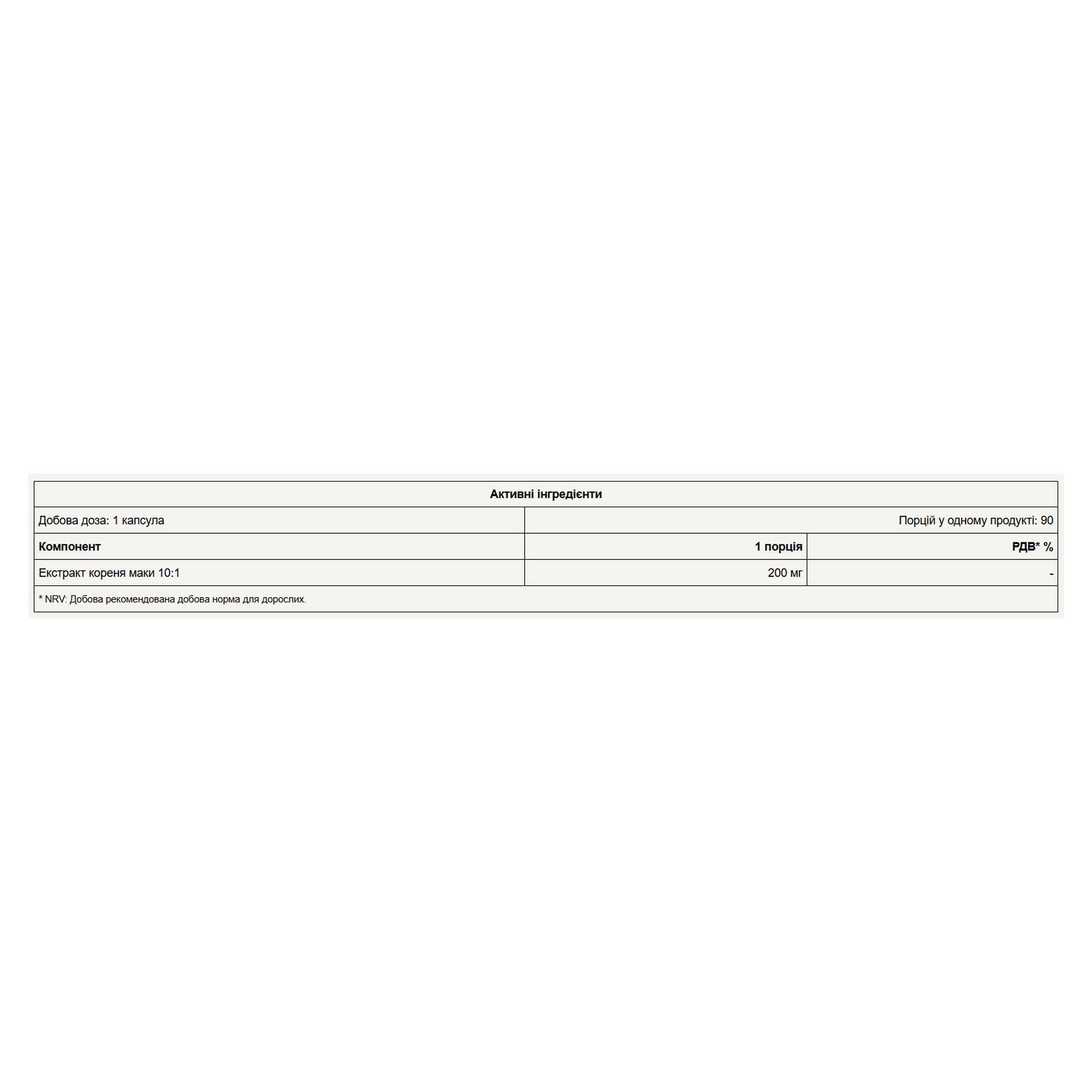 Склад : кукурудзяний крохмаль, екстракт кореня маки (Lepidium meyenii) 10:1, оболонка капсули (гідроксипропілметилцелюлоза), агент, що запобігає злежуванню (магнієві солі жирних кислот).