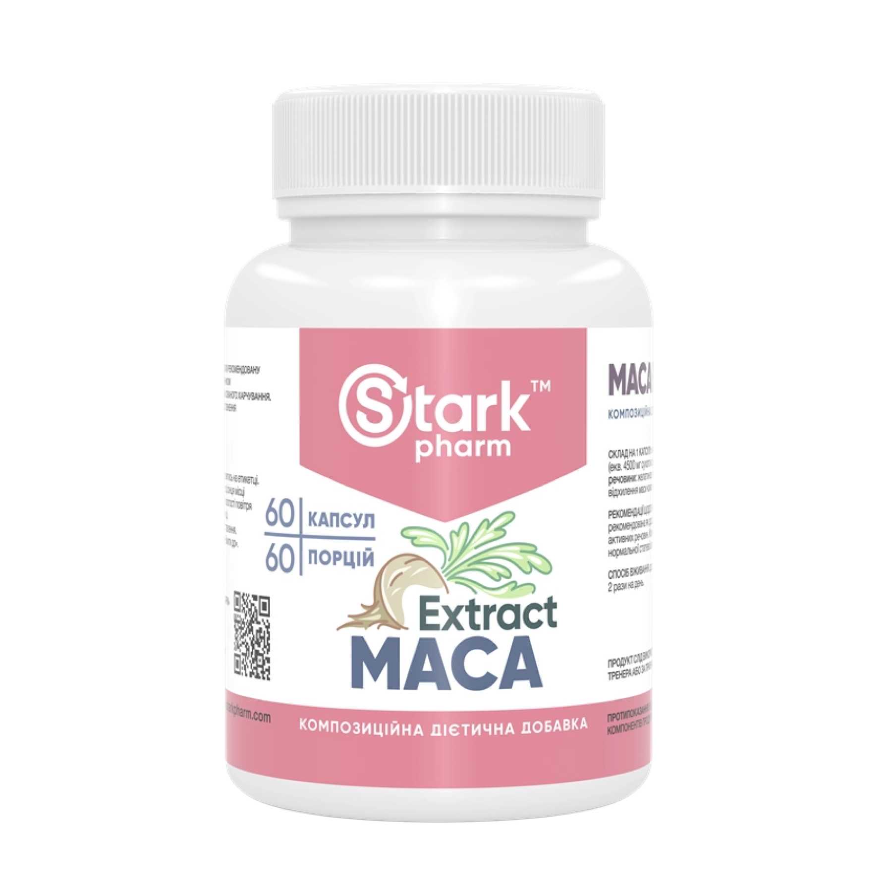 Харчова добавка Stark Pharm – Stark Maca Extract містить екстракт з кореня маки, рослини, яка відома своїми адоптогенними властивостями. Крім того, екстракт маки вважається найпоширенішим природним афродизіаком.