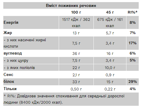 Інформація про алергени: виготовлено на заводі, який переробляє молоко, яйця, глютен, сою, арахіс, лісові горіхи, рибу та інгредієнти ракоподібних. Може містити сліди арахісу, деревних горіхів і насіння кунжуту.