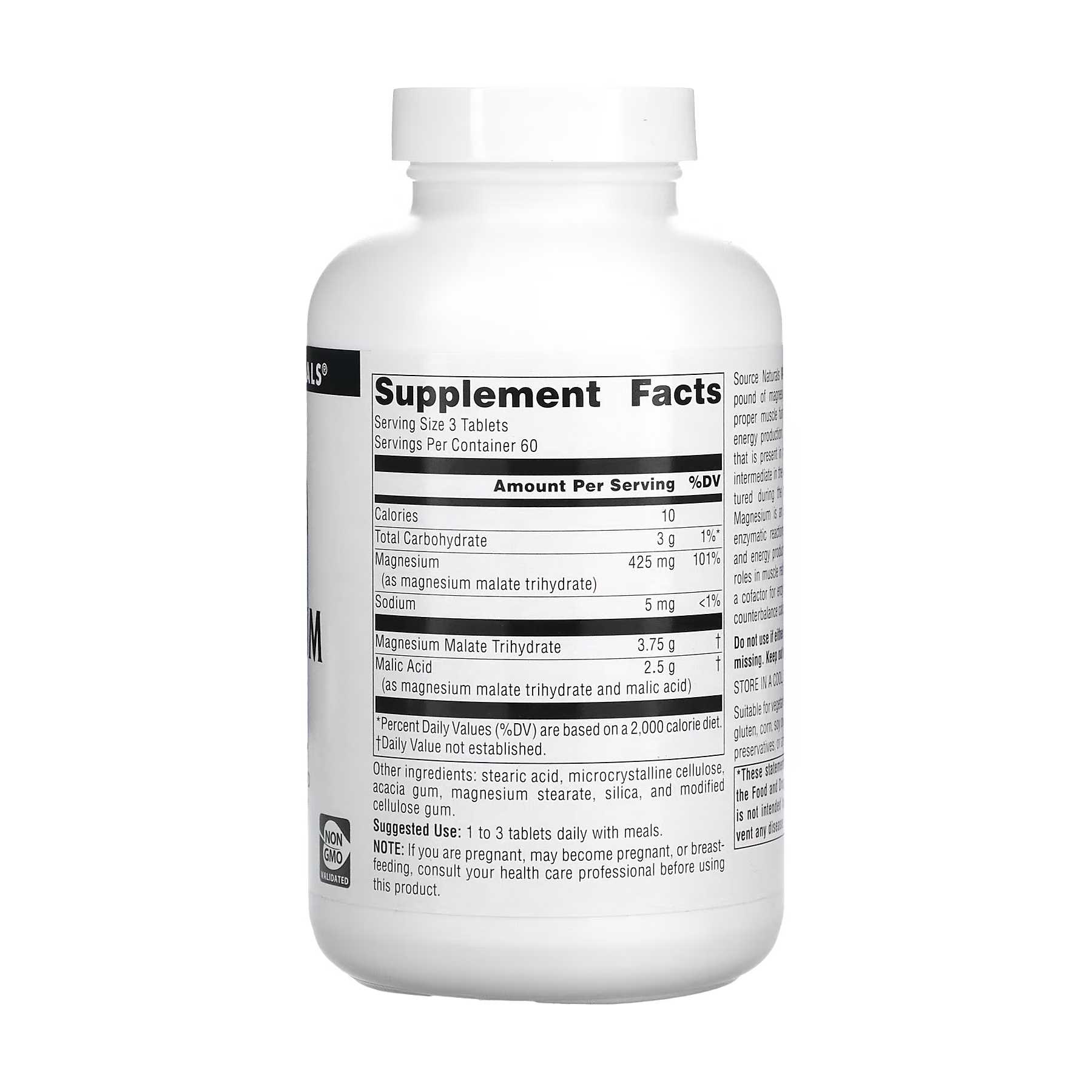 Малат магнію від Source Naturals — це комплекс магнію і яблучної кислоти. Він підтримує функцію м’язів, здоров’я серцево-судинної системи і сприяє виробленню енергії. Яблучна кислота — натуральна фруктова кислота, що міститься в більшості клітин організму і бере участь у циклі Кребса, у якому енергія зберігається під час метаболізму вуглеводів і жирів. Магній — кофактор, необхідний для більш ніж 300 ферментних реакцій метаболізму, синтезу АТФ і вироблення енергії. Магній відіграє важливу роль у розслабленні м’язів через його функції кофактора для ферментів і завдяки здатності врівноважувати кальцій у клітині.